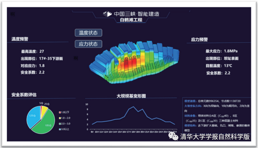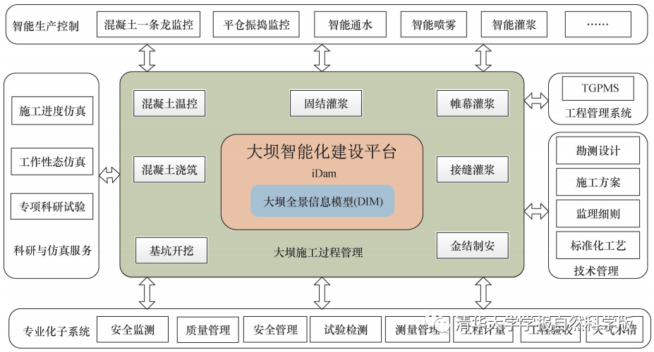 白鹤滩、乌东德工程大坝智能建造以现场问题为导向,按混凝土施工全过程实时监控、混凝土温控全过程实时控制、低热水泥混凝土性能复核、全生命周期工作性态仿真、智能建造信息管理平台等五大方面进行构架,借助最新的传感技术、通信技术、数据技术、建造技术及项目管理知识,构建了面向关键施工工艺和业务流程的智能建造技术,开发了管理平台,研发了成套的智能通水、智能灌浆、智能振捣等装备,提升了工程建设管理水平,推动行业技术发展。同时,充分发挥市场竞争的合同机制与科技创新团队的专业优势相结合,建立了长效、常态化的产学研用深度融合协同创新的体制机制,为工程建设、蓄水过程及初期运行提供技术支持。