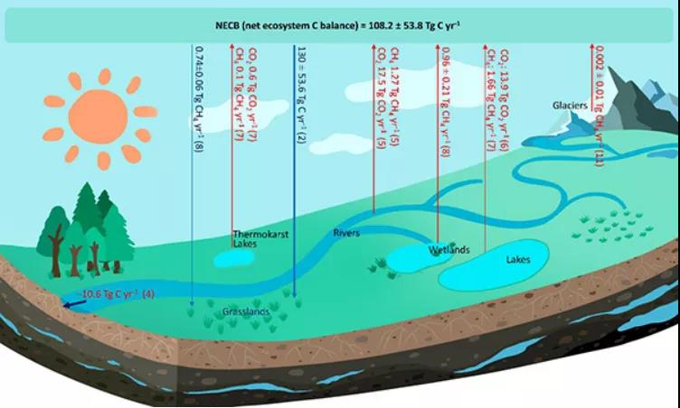 研究发现,高寒草地是重要的CO2和CH4汇,而水体向外界水平输送的碳是主要潜在流失路径。河流通过水平运移和垂向释放(CO2和CH4)共抵消了陆地CO2汇的12.6%,高寒湿地、湖泊、热融湖塘、冰川等通过碳损失抵消了陆地碳汇的4.2%。综上,青藏高原陆表水体路径的碳流失仅抵消高寒生态系统CO2汇的16.8%,陆地生态系统CO2汇仍主导区域净碳平衡。