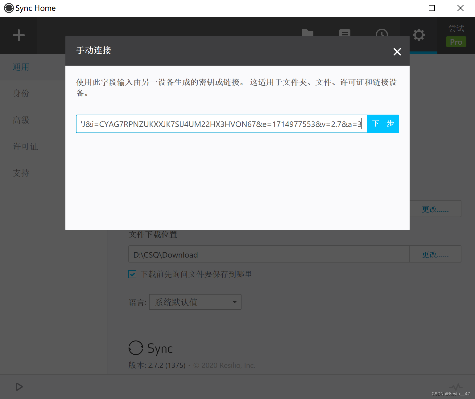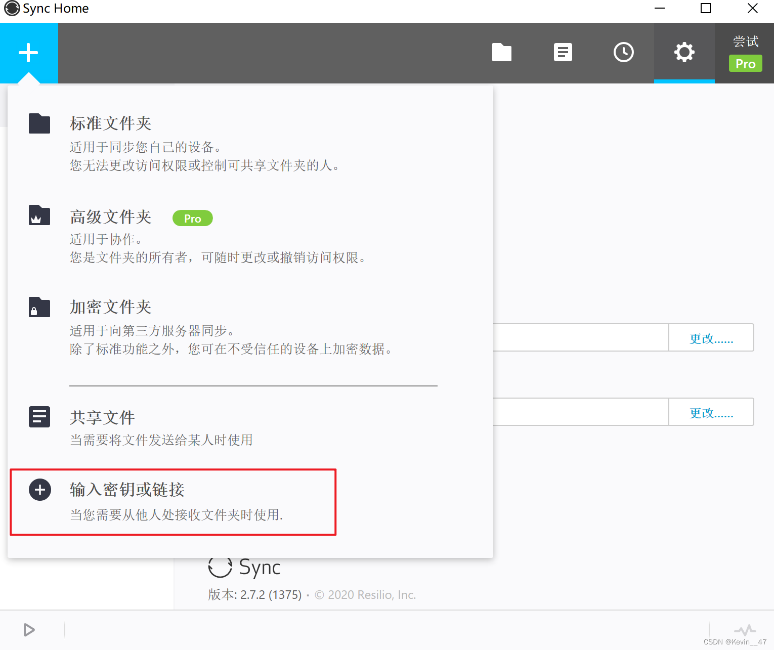 在主机的Resilio Sync点击左侧“+”,点击输入密钥或链接。