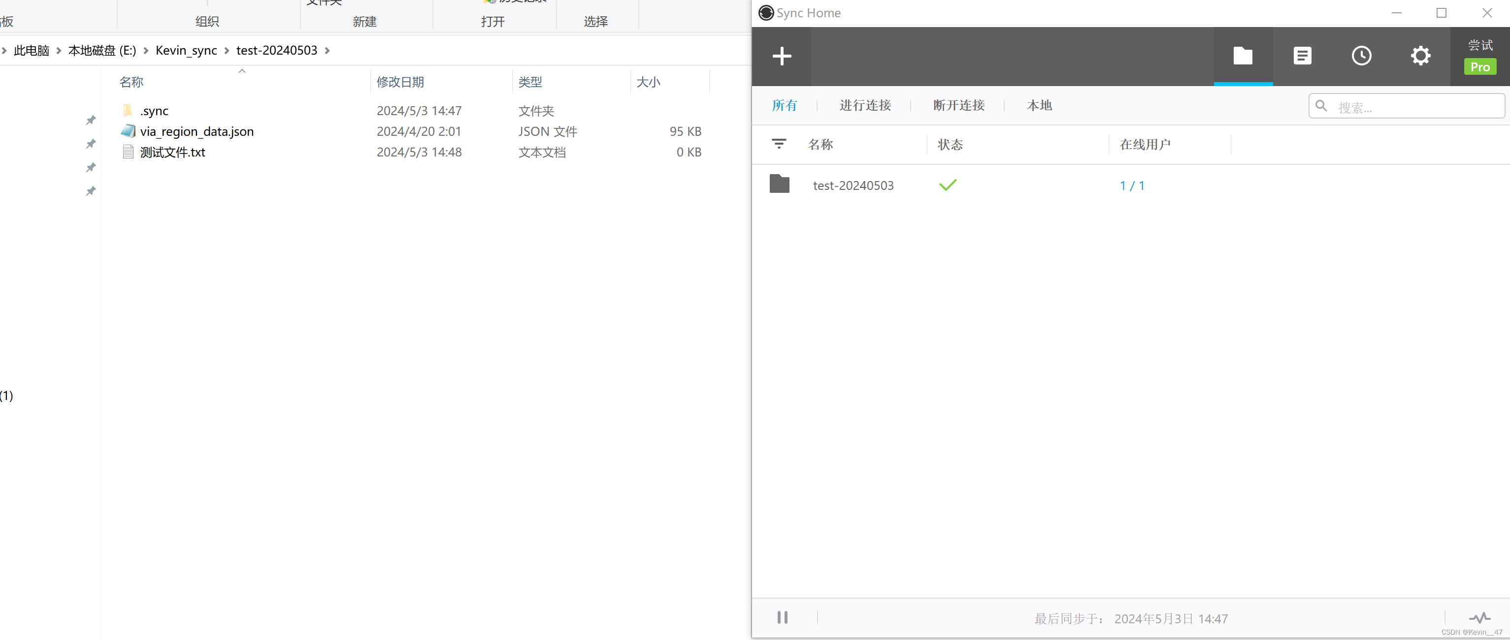 当左下角按钮为继续同步时,在另一台机器中操作的文件会直接自动同步到本机中,而且延时很低。