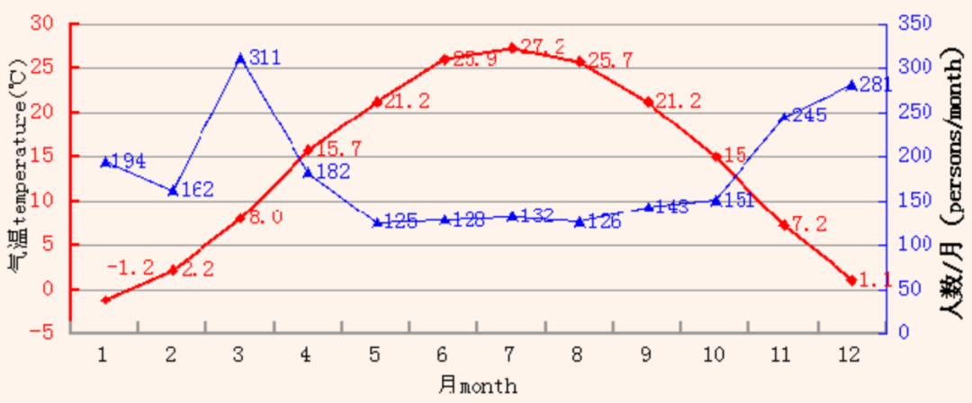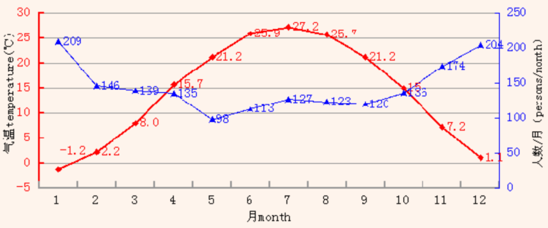 图2 安阳市2010~2012年各月平均气温与呼吸道疾病就诊人数(高翔等,2015)