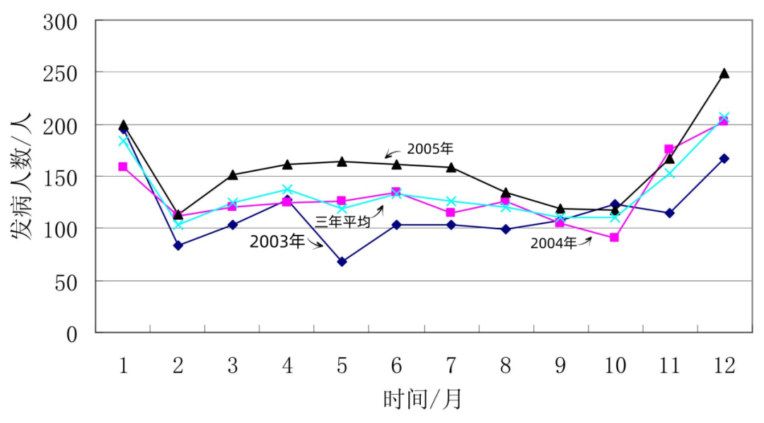 图1 兰州大学第二医院2003~2005年逐月平均呼吸道疾病就诊人数(景文超等,2011)