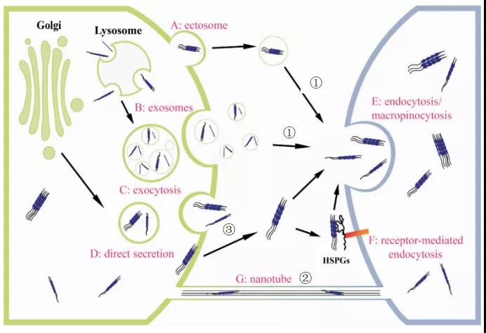 图2. Tau蛋白传播途径:①Tau种子病理传播(上游离体、下外泌体)②神经元离子通道传播 ③跨突触传播。引自:李思苹等,《中国病理生理杂志》,2019