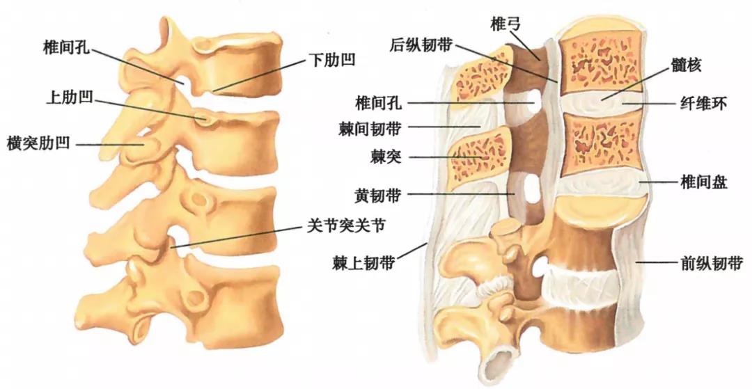 椎骨和它周围的韧带、椎间盘相互连接形成脊椎,脊椎又被分为:颈椎、胸椎、腰椎和骶椎四部分。脊椎与脊髓的关系颇类似于地铁建筑和地铁的关系,这趟地铁主要经过四站:颈椎、胸椎、腰椎、骶椎。节节椎骨构架起地下建筑的坚韧支撑,主要搭建起一个被称为椎管的坚固隧道容纳精细而脆弱的地铁——脊髓。各种韧带则为隧道与地铁站添砖加瓦进行室内装修,使之更为牢固和平整。椎骨间用椎间盘相接,为椎骨的活动提供弹性和减震效果。相邻椎骨间形成的椎间孔,是地铁站的不同出入口,使从不同区域来到的神经经过不同的入口汇入脊髓,确保了系统的有序和高效。此外椎管、椎间孔中还有为地铁提供能量的营养脊髓的血管通过。