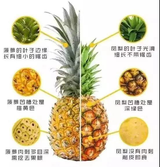 为此,许多人还总结出“凤梨鉴别大全”,比如菠萝表面有刺扎手,“凤梨”表面则比较光滑;菠萝有黑色的毛眼,凤梨没有毛眼;菠萝更酸,凤梨更甜等诸多特征,目的就是防止买回的“凤梨”中混入菠萝。