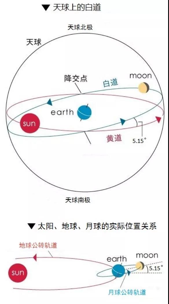 如果没有白道与黄道之间约为5.15°的夹角,白道与黄道重合在一起,每月阴历十五,月球运转到太阳与地球连线上时,都会被地球完全挡住而发生月食;每月阴历初一,当月球运转到太阳与地球中间时,太阳都会被月球挡住而发生日食。因为有了这个黄白夹角,月球的位置会偏离黄道面。只有当黄道面与白道面的交线与日地连线基本重合时,至少两条线夹角不太大时,才能保证当太阳、地球和月球在黄道面内满足三点一线时,月球不会偏离黄道面太多,这样才会发生日食和月食。