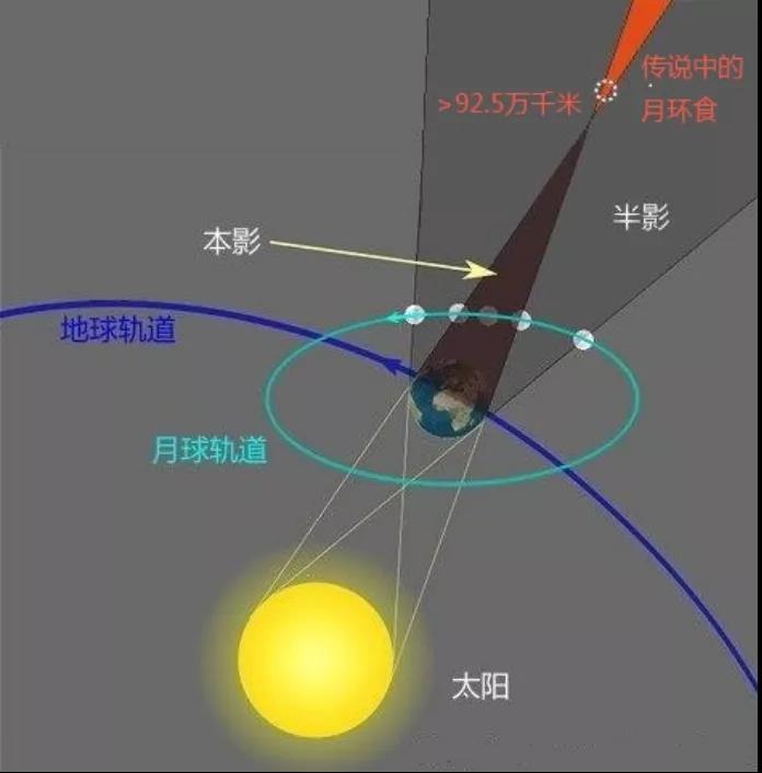 月食是指地球位于太阳和月亮之间,并且三者在一条直线上,月球进入地球的影子里,地球挡住了照到月球上的太阳光,而使月球部分变暗或者全部变暗。同样的,由于太阳是一个面光源,地球的影子也分为本影和半影。当月球运行到地球的半影中,就会发生半影月食,月亮只是稍微变暗一点,像是披上了一层薄纱;当月球运行到地球的本影中,就会发生本影月食。本影月食又分为月偏食和月全食:当月球一部分进入本影,另一部分就会在半影中,此时就会形成月偏食;当月亮完全进入本影,就会被全部挡住,形成月全食,此时阳光虽然被地球完全挡住,但是透过地球大气折射,仍有一部分太阳光照到月球上,这部分被折射到月球上的光以波长较长的红光为主,所以月全食时月亮看上去是红色的,称为“红月亮”。由于黄白交角,当月球与地球和太阳在黄道面内满足三点一线,但月球往上或者往下偏离了黄道面,月球就会部分地穿越本影,从而形成月偏食。那么会不会发生“月环食”呢?我们可以通过简单计算来验证一下。太阳到地球的距离是1.5亿千米,太阳直径是地球直径的109倍,如果要发生日环食,需要月球处于远离地球的那部分本影中。两个圆锥形本影交界的地方就是圆锥顶点,这个顶点距离地球92.5万公里,而月球到地球最远距离为40.6万千米,显然,无法到达“月环食”的距离。因此,目前的日地距离和地月距离决定了不会发生“月环食”。
