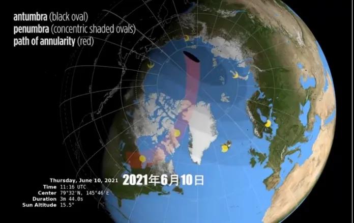 你方唱罢我登场。“超级红月亮”的兴奋劲儿还没有过去,时隔半个月之后的6月10日,又一场精彩天象——日环食在天空上演了。日环食就是当月亮位于太阳和地球之间,三者位于一条直线上时,月亮挡住了太阳,并且由于月球距离地球较远,不能完全挡住太阳,只能挡住太阳“金盘子”的中间部分,而留下一圈的金边,就像一个金子做的指环。在人们无法解释自然现象的古代,日食带给人们恐惧,被认为是灾难来临的征兆。尤其是日环食,好好的一个“金盘子”,被莫名其妙的挖空了一个洞,只剩下一圈残余的金边,就更恐怖了。然而这次日环食,是由于太阳、地、月球之间的轨道关系决定的,是半个月前“超级红月亮”的带来的“连环表演”。因为5月26日的月全食是由于白道和黄道交线于日地连线基本重合,半个月后,这种条件依然存在;月全食期间恰逢月球位于近地点附近,半个月后,月球恰好位于远地点。这样,就形成了月球在地球中间,由于黄白交线靠近日地连线,三者基本位于一条直线上,可以形成日食;同时由于月球距离地球较远,因此可以形成日环食。因为日食可以看作是月球的影子投射到了地球上,这次日食又发生在夏至前的十几天,地球是以倾斜23.5°的姿势围绕太阳公转的,北极朝向太阳,月球的本影只能投射到北极地区,同时考虑这次日环食期间地球自转的位置,因此只能在跨越北极的很窄的区域才可以看到。我国部分地区可以看到日偏食。