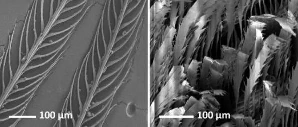 华美极乐鸟就不一样了。在高倍电镜下,它们的羽毛并非平铺而是向上弯曲,并且非常密集,像叠罗汉似的一层层往上摞。另外每根羽毛上还具有复杂的分支结构,大大增加了其表面的不规则性。