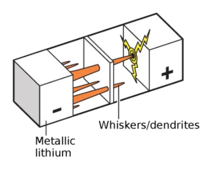 图4 锂金属负极会生长锂枝晶,进而刺穿隔膜造成电池失效或安全事故[1]