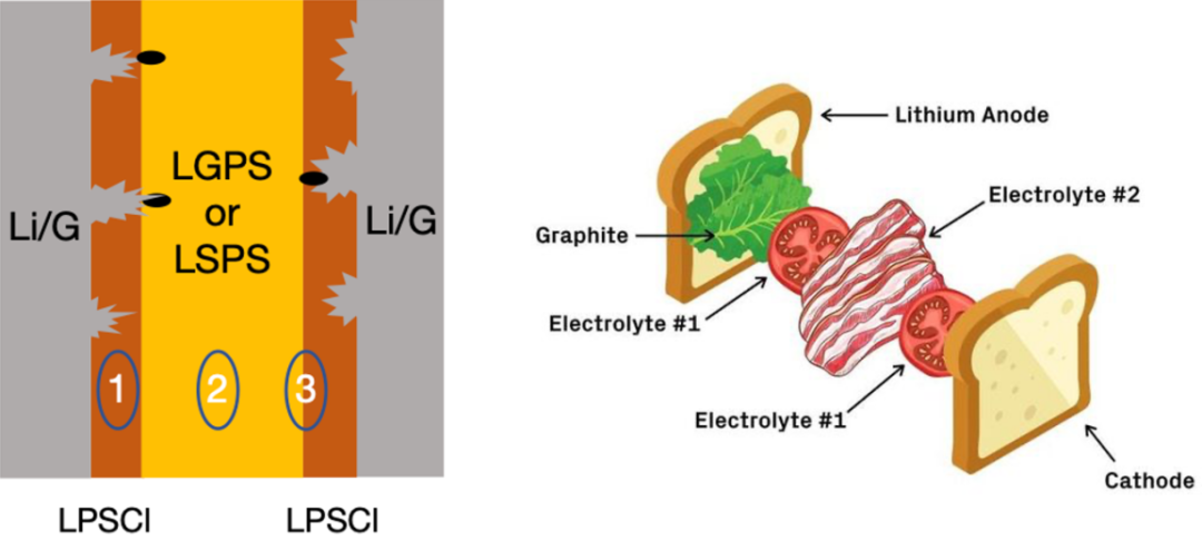 图6 高稳定性的多层固态电解质结构。中间层的较不稳定的电解质层如同汉堡中间的培根,保证了电解质不被枝晶刺穿[3-4]