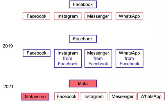 Facebook改名这件事,正如图1-6所示,在2019之前,Facebook公司的架构是上面是Facebook公司名和主品牌,下面是四个相对独立的品牌,这几个品牌相互独立的好处是相互之间影响和耦合度要小一些,比如说一个品牌经营不好、用户的口碑不好、由于政治或自身经营的一些问题,那么它对其它品牌影响不大,这样的好处是大家可以独自经营,制定自己的经营战略。到了2019年之后,Facebook把公司品牌进行了修改,强化了Facebook的主品牌,然后将其它的二级品牌强化到Facebook下面来,当时就有人说Facebook树大招风,比如说政治、经济、经营问题以及客户的一些反馈,怕Facebook影响其它二级品牌的发展,而事实上确实是这样,它的自身经营出现了问题,所以到了2021年,Facebook公司改为元宇宙公司的时候,把二级品牌全部脱离主品牌,和主品牌解耦,将Facebook题品牌降为二级品牌。对于这件事情,市场上有很多看法,一类观点认为,Facebook在规避“品牌税”,使Facebook公司旗下的二级品牌摆脱Facebook的负面影响;另一类观点认为,这是Facebook的又一次商业操作,而事实也确实如此,Facebook改名的那一天的股票是上涨的,而且全球也随着元宇宙的节奏使元宇宙这个风口比以前更加踊跃。