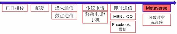 其实,这两个观点有一定的道理,即上述操作有一箭双雕的意思,但也不全是,主要还是企业战略经营策略的一些变化,为什么这么说?从通信发展史的角度,如图1-7所示,也就是人与人之间的通信,来看元宇宙到来的必然性,我们就能看到作为社交网络平台,像Facebook这样的龙头企业,它是如何迎接通信发展到来的新时代。首先,人类早期社会信息传递的方式,口口相传。之后,通过邮差使信息传递的更远,虽然效率低,但却提高了信息传输距离。然后,为应对战争或突发情况,需要更快地传递信息,就有了烽火通讯。随着科学技术的快速发展,出现了革命性的固定电话以及近来的移动电话。再往后,就出现了即时通信,比较典型有MSN、QQ,再进一步升级,Facebook、微信这一类的即时通讯工具和社交平台就出现了。在元宇宙出现之前,即时通信工具已经做得很好了,大家可以实时的通信、留言、语音、视频等。但是这些都有一个共同特点,即人和人之间的通信还是隔着一层屏幕,我们自己并没有进入到虚拟空间中。