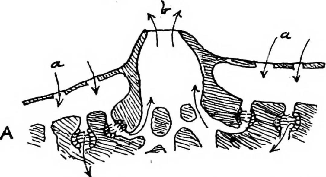 在海洋中,海水由流入孔进入到水管腔,然后再经由流出孔排出体外,这套水流的路线也被称为“管道系统”。不过,海绵的身上虽然全是“孔”,但水不会自己流入流出,必须要有一股压力来推动水流朝着一个方向运动,而这一工作由海绵中的领鞭毛细胞担任。